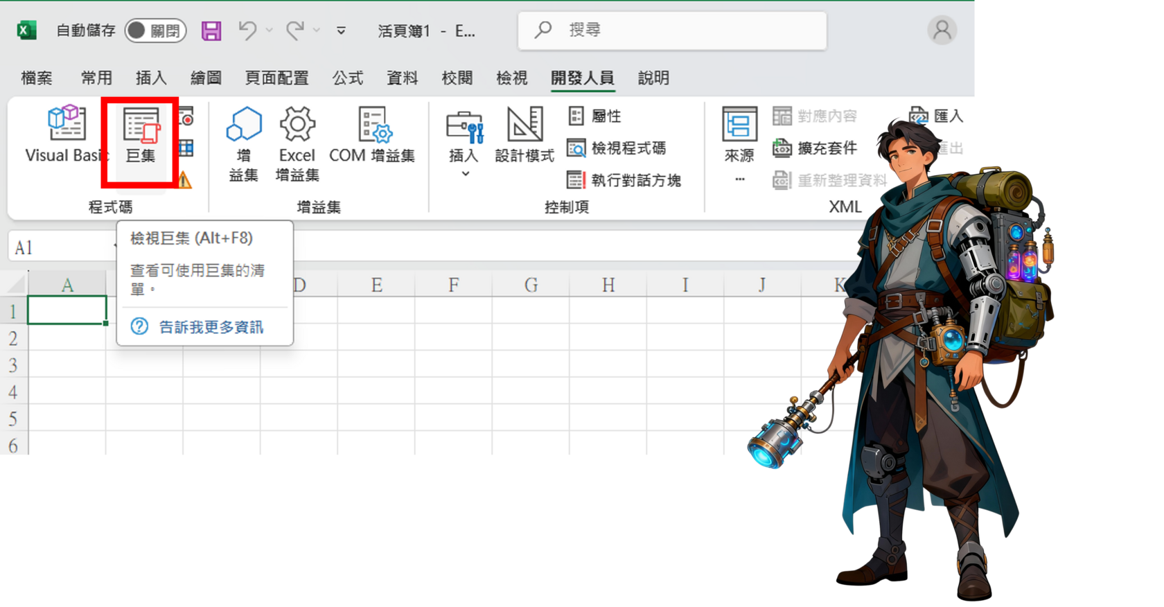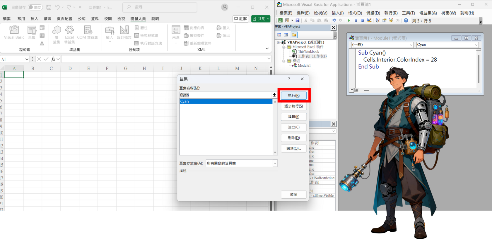 - 回到 VBA Editor 功能頁,點「執行」功能區的「巨集」或在 Excel 點「開發人員」→「巨集」。