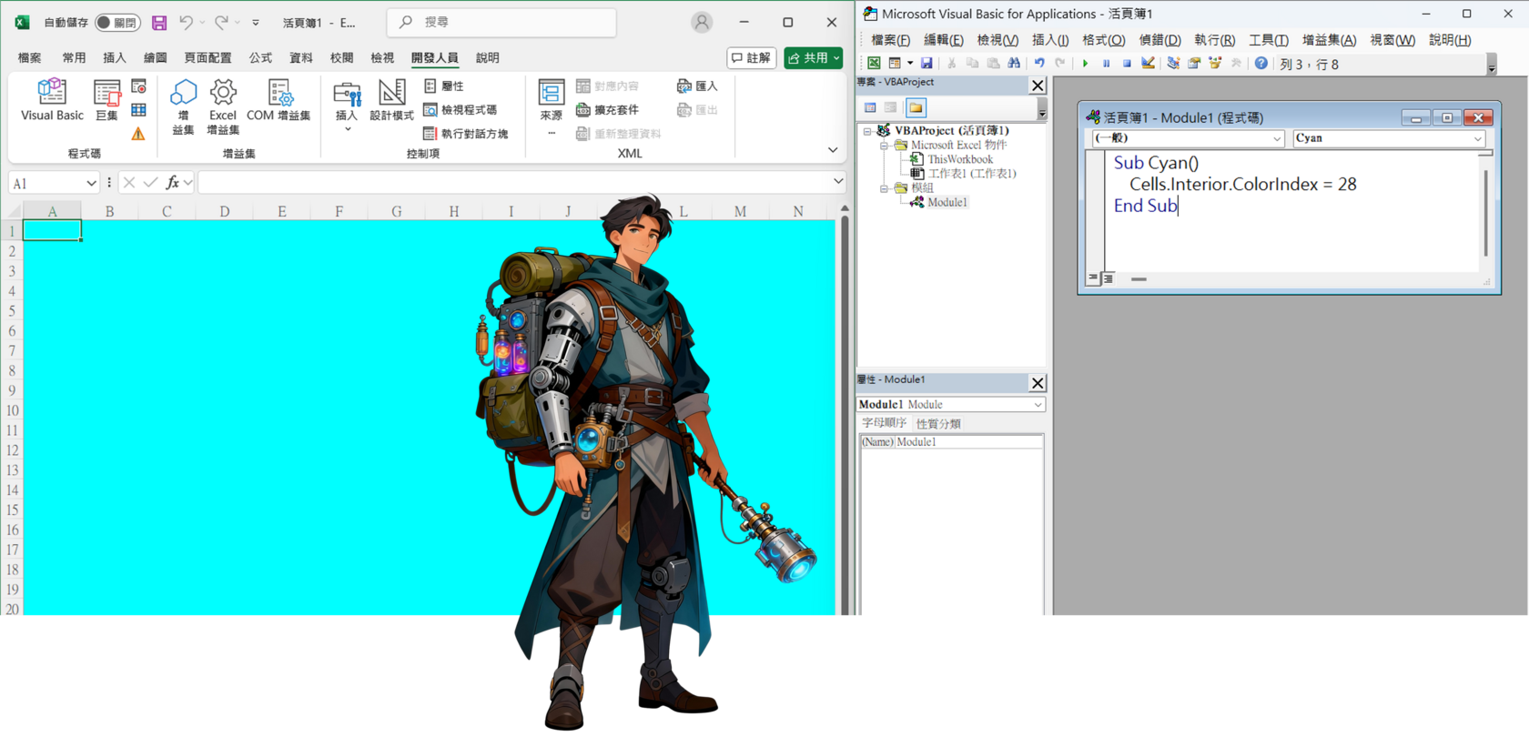 全團齊聲:「Wow!」只要執行這個模組咒語,任何選定的工作表皆會瞬間染上青色魔法。